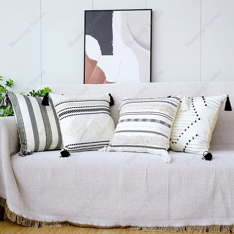 Apportez du caractère à votre canapé avec cette collection de coussins noir et blanc au style bohème chic. Motifs tissés, reliefs texturés, rayures graphiques et pompons aux quatre coins composent un ensemble harmonieux qui réveille instantanément un salon, une chambre ou un coin lecture.