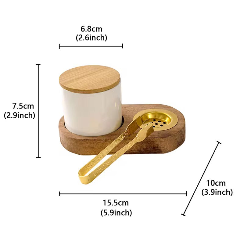 Un concentré d’élégance et de fonctionnalité pour vos moments de relaxation. Ce set complet allie un brûleur doré raffiné, une boîte de rangement en céramique avec couvercle en bambou, et une pince gravée pour manipuler vos encens en toute sécurité. Le tout repose sur une base en bois lisse, chaleureuse et minimaliste.