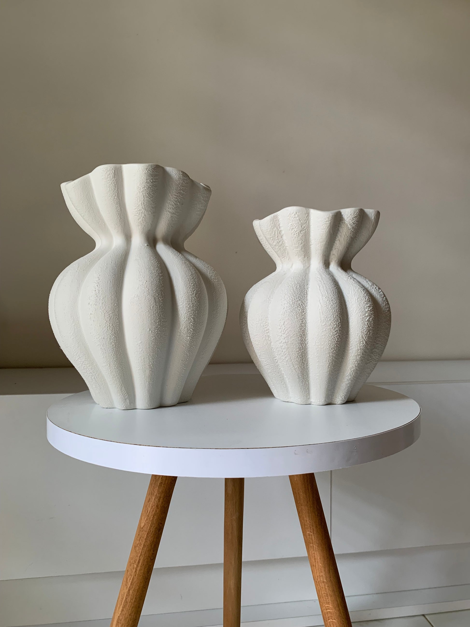 Avec leur forme inspirée de fleurs épanouies, ces vases en céramique texturée semblent capturer un mouvement figé dans le temps. Leur finition blanche légèrement granuleuse capte la lumière avec douceur et sublime les fleurs séchées ou les simples branches de feuillage.