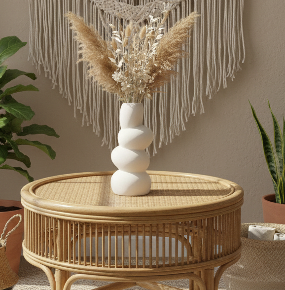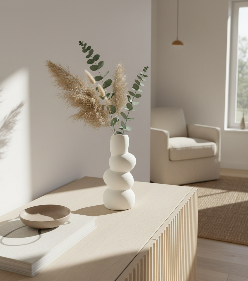 Associez-le à des bougies sculpturales ou à d’autres vases blancs pour créer une composition ton sur ton, ou jouez le contraste avec des fleurs colorées (tulipes, gypsophiles, fleurs séchées naturelles).