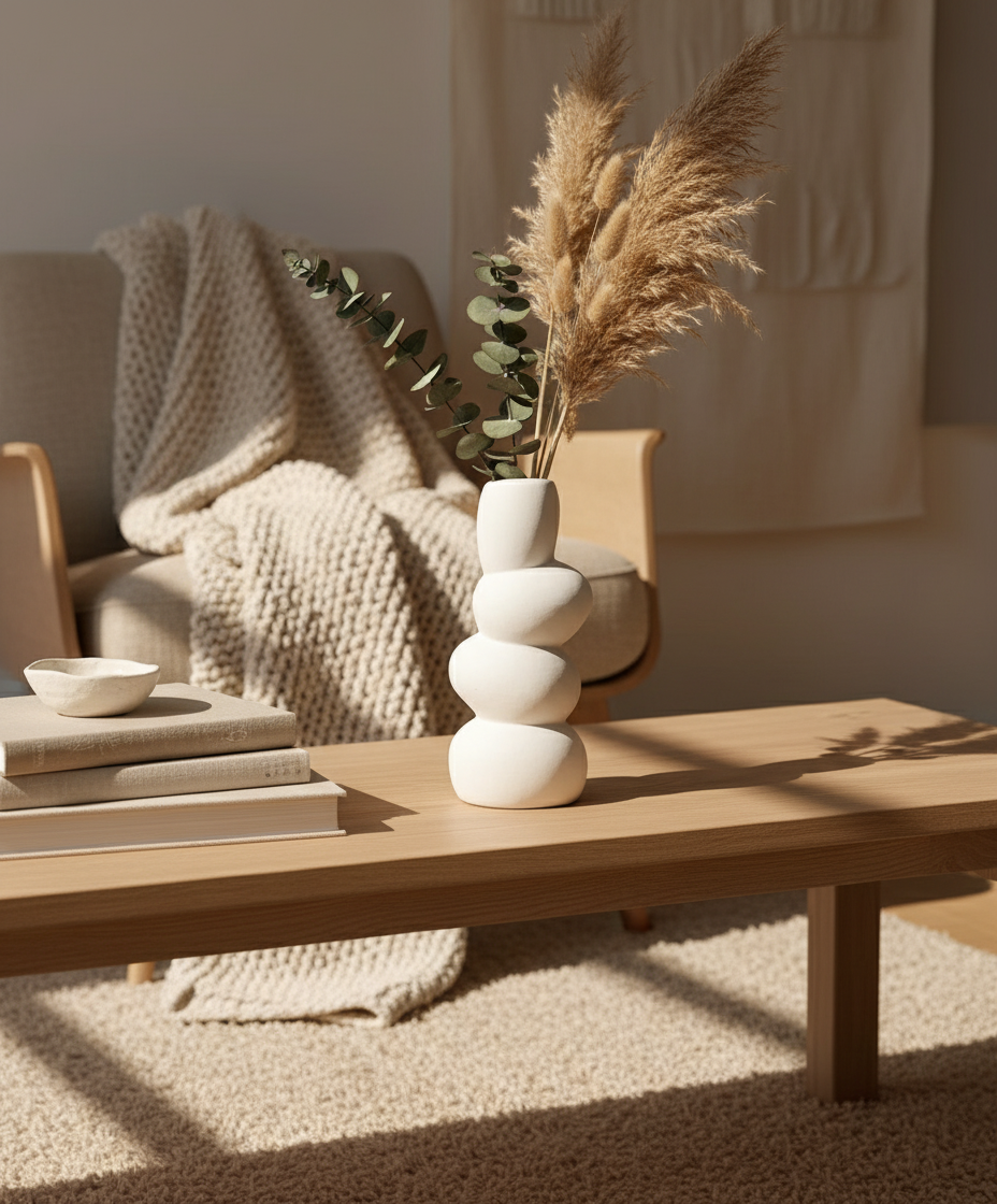 Avec sa silhouette sculpturale composée de formes arrondies empilées, ce vase Blanc apporte une touche artistique à votre décoration. Sa finition mate et son blanc doux s’intègrent parfaitement dans les intérieurs minimalistes, wabi-sabi ou scandinaves. Idéal pour sublimer quelques tiges de fleurs séchées ou fraîches, il devient à lui seul une véritable pièce déco.